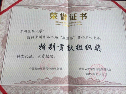 本次大赛,全省共有22所高校的22,380多名学生参加了网络初赛。其中69名选手脱颖而出,于2015年11月1日参加了“贵州省第二届“联盟杯”高校英语写作大赛”的总决赛。我校共有七名同学参加了总决赛的激烈角逐。最终,基础医学院的罗力同学荣获了一等奖;口腔医学院李姣同学、药学院陈露露同学荣获二等奖;黄瓜视频