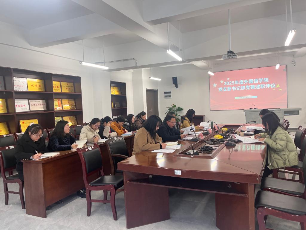 12月23日,为深入学习贯彻党的二十大及二十届历次全会精神,扎实做好基层党建工作,充分发挥基层党支部战斗堡垒作用,外国语学院在云漫湖校区学院会议室开展2025年度基层党支部书记抓支部党建述职评议考核,学校第三督导组组长钱禾、联络员保莎到会指导。会议由学院党委书记、院长付启宏主持,学院党委班子成员、组织员、全体支部书记、各党支部支委以及党员代表参加了会议。
