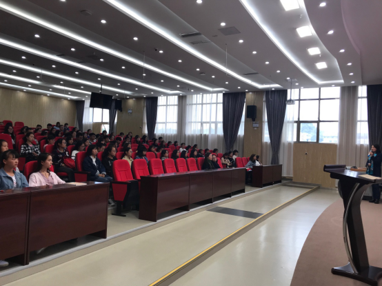 在广德楼六楼电教中心演播厅召开了2018级新生入学教育大会,党委书记张婷婷、主持工作副院长龙芸、英语教研室主任余兰、辅导员徐艺娟等老师及2018级全体新生参加了此次会议,大会由徐艺娟主持。