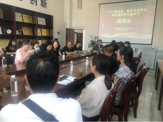 会议室开展了赴花溪区中小学实习启动会。出席此次会议的有花溪区教育局人事科李光伟科长和花溪区14所中小学负责人,以及外国语学院党委书记张婷婷、院长龙芸、党委副书记马琳娜、生产实习科黎文清、教学管理科冷凤老师也参加了会议。