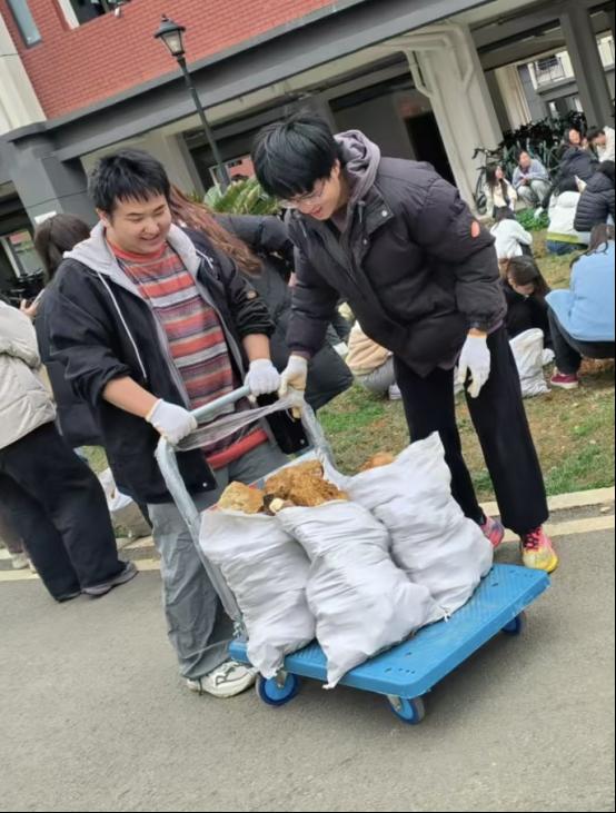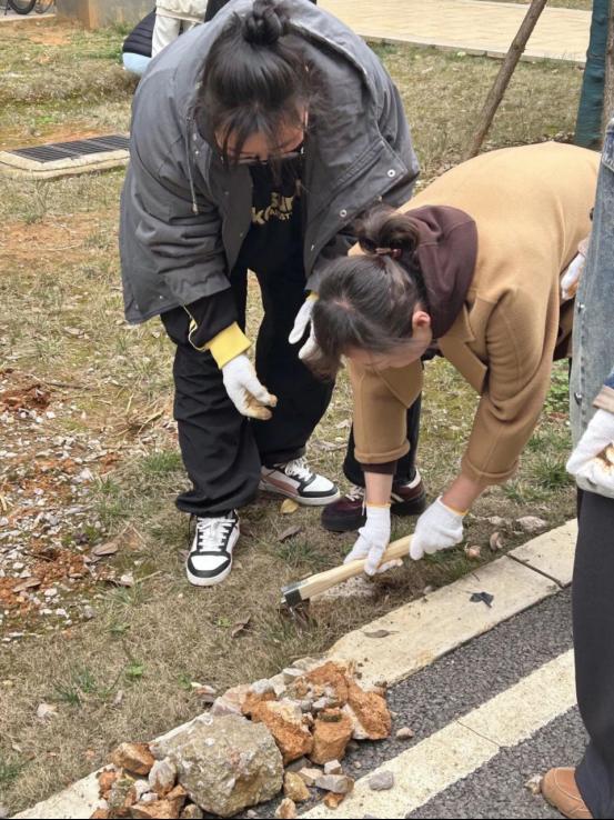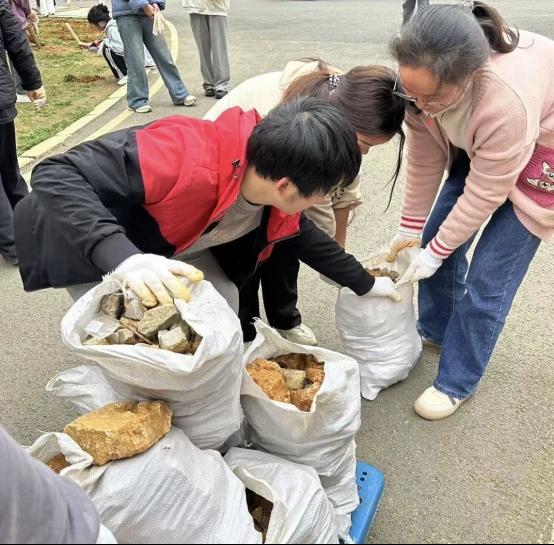 活动现场,大家分工明确,一部分同学负责捡拾绿化区域中的石头、石子及垃圾废品,他们仔细清理着每一处角落,为后续的种植工作做好准备;另一部分同学则拿起工具,开始松土、撒花种、施肥。师生齐心协力,共同为校园增添了一抹新绿。