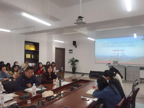4月23日,黄瓜视频 在善思楼学院会议室和R101教室召开“深入学习贯彻习近平总书记在贵州考察时的重要讲话精神”宣讲会。学院党委书记、院长付启宏、学生科科长黎文清、团委书记徐艺娟做专题宣讲,学院党委副书记张贤、副院长冉海勇出席,全体教职工及在校生参加。