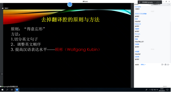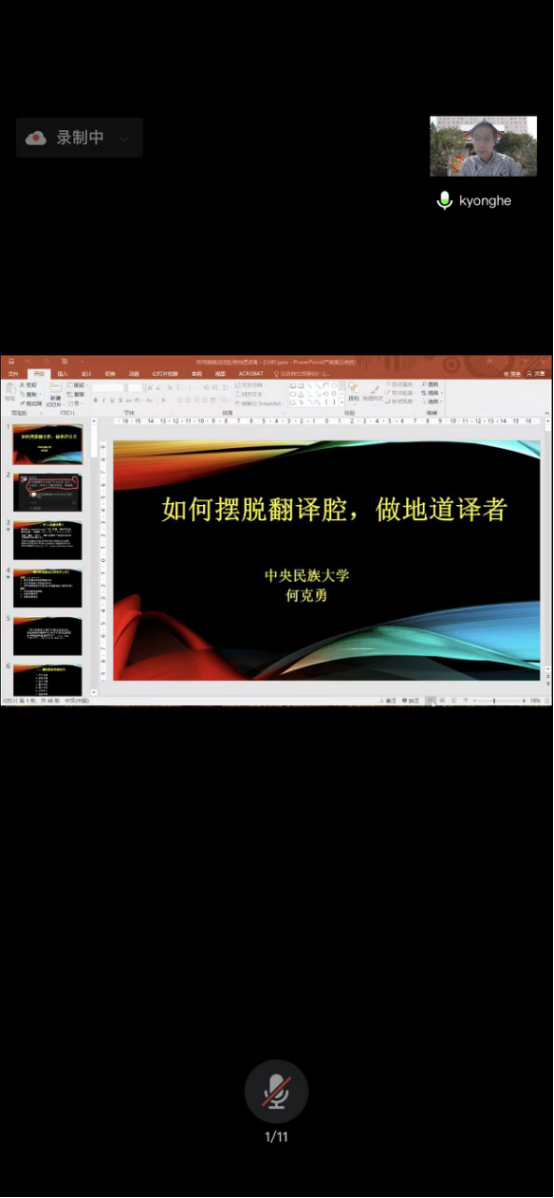 翻译系教授、翻译方向博士生导师何克勇,通过腾讯会议云端为黄瓜视频